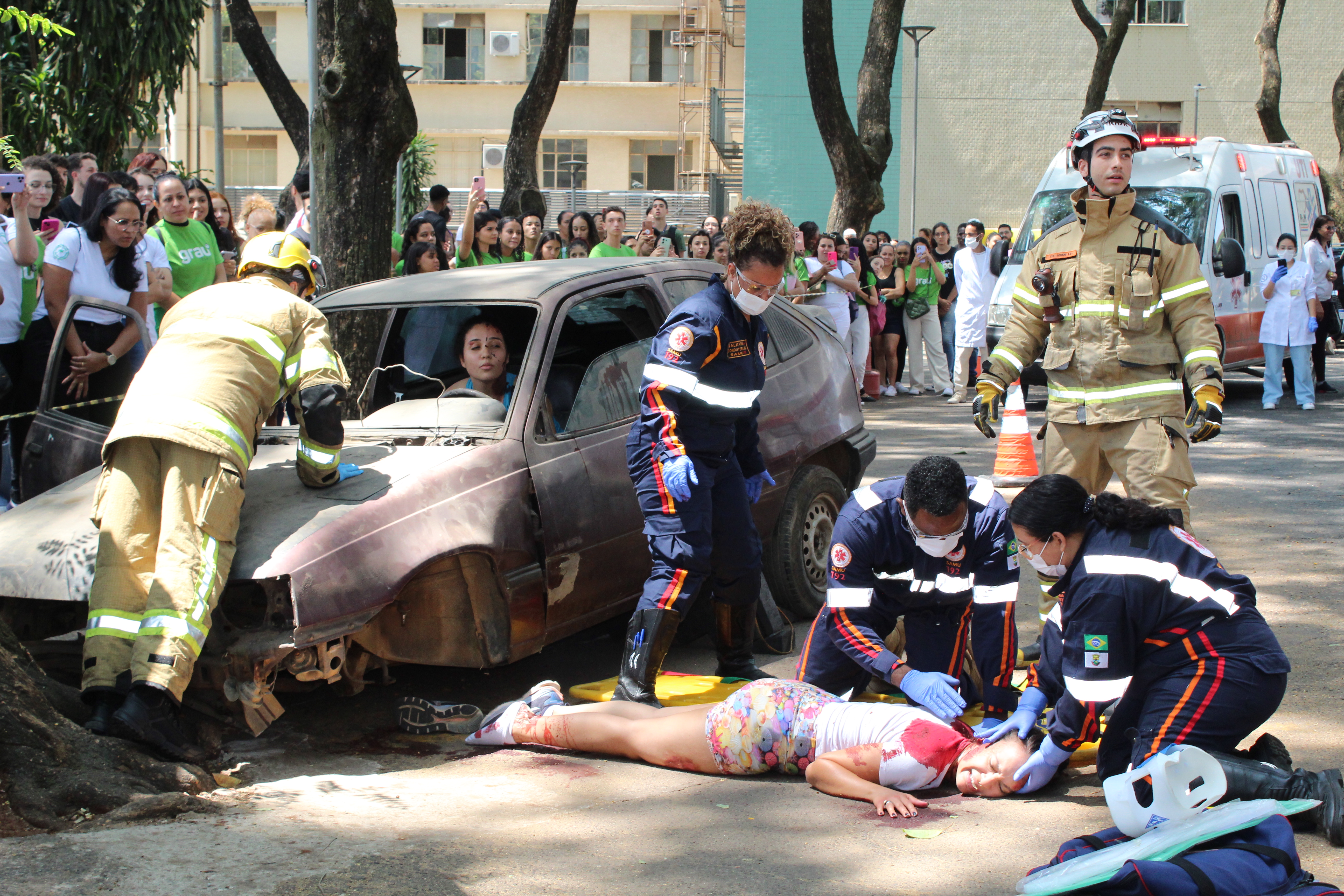 Com a participação dos órgãos que compõem o sistema de resposta às urgências e emergências em Belo Horizonte, o Serviço de Atendimento Móvel de Urgência de Belo Horizonte (Samu BH) e o Corpo de Bombeiros Militar de Minas Gerais (CBMMG), será simulado um acidente envolvendo um veículo de passeio conduzido por um motorista sonolento e desatento que atropela um motociclista entregador de aplicativo e procura em seu celular o local da entrega. Na tentativa de desviar do motociclista, atinge outro veículo, que colide bruscamente com uma árvore.