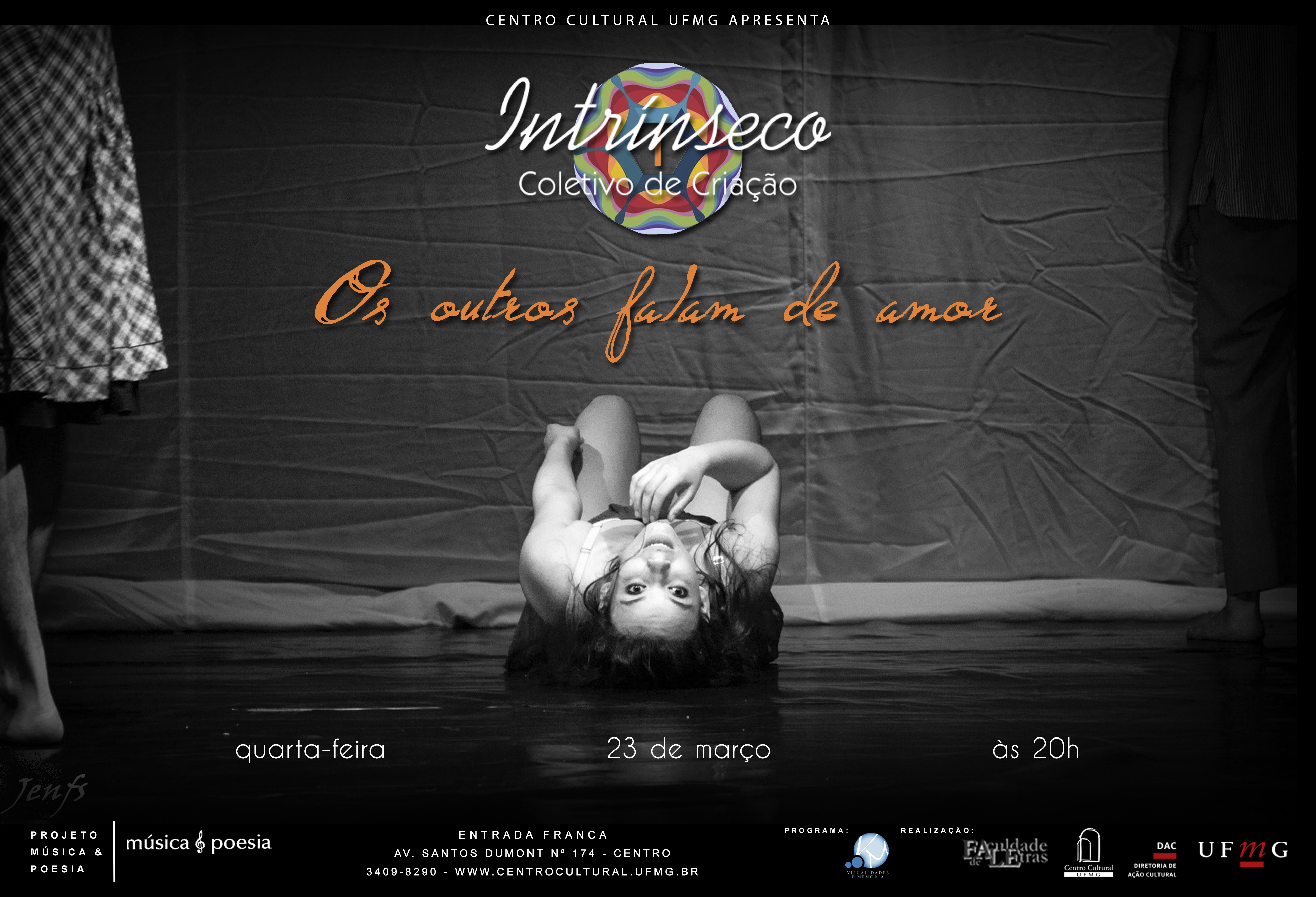 Na quarta-feira, dia 23 de março, às 20h, o projeto Música e Poesia recebe no hall superior do segundo andar do Centro Cultural UFMG o grupo Intrínseco Coletivo de Criação com a performance Os outros falam de amor. A entrada é gratuita.