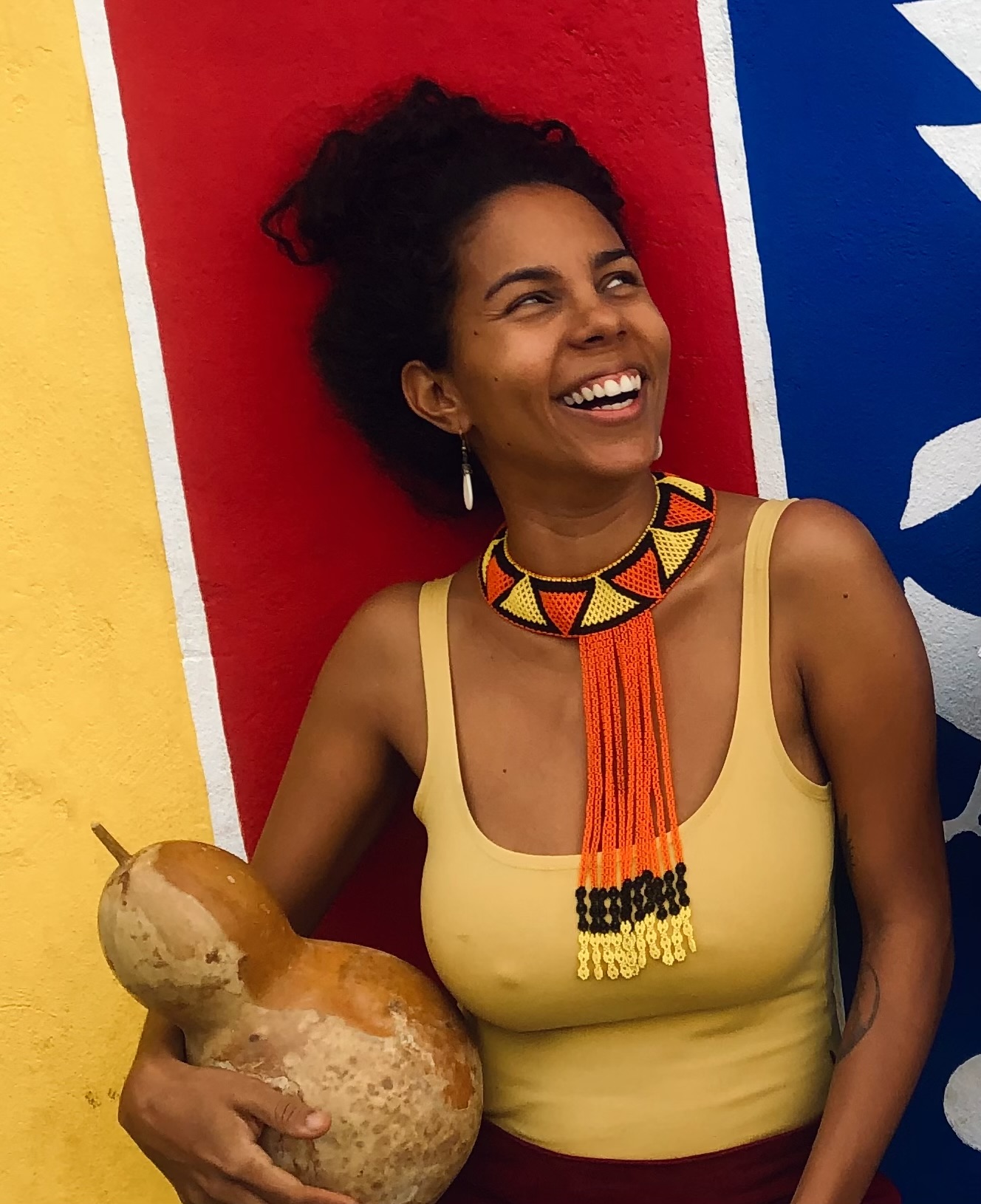 Izabella Amora é mulher negra de origem indígena Puri, mãe, ativista cultural e alimentar. Formada no curso de Licenciatura em Artes Plásticas pela Escola Guignard (UEMG) e habilitada em Cerâmica. Realiza trabalhos com pintura, fotografia, desenho, escultura, colagem e performance. É arte educadora e arte terapeuta. Artista gráfica, produtora de artes e panfletos digitais. É treinel de Capoeira Angola e co-responsável do Coletivo Cultural Angola de Ouro, no qual ministra aulas para crianças e adultos. Anfitriã na Casa Bantu, espaço cultural dedicado a estudos de capoeira angola, samba de roda, jongo, coco de roda, dança afro e outras manifestações afrobrasileiras. Pesquisadora do canto, toque e corporeidade nas manifestações culturais de matriz africana e indígena.