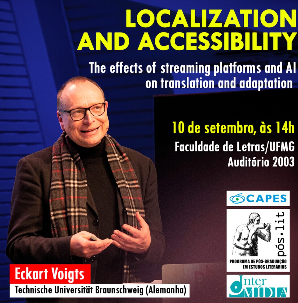 O grupo de pesquisa Intermídia: Estudos sobre a Intermidialidade (CNPq) receberá, no dia 10 de setembro, às 14h, no Auditório 2003 da Faculdade de Letras (Fale) da UFMG, o professor Eckart Voigts (Technische Universität Braunschweig) com a conferência Localization and Accessibility: the effects of streaming platforms and AI on translation and adaptation. O evento conta com o apoio da Coordenação de Aperfeiçoamento de Pessoal de Nível Superior (Capes) e do Programa de Pós-Graduação em Estudos Literários (Poslit/) da UFMG. Não há necessidade de inscrição prévia.
