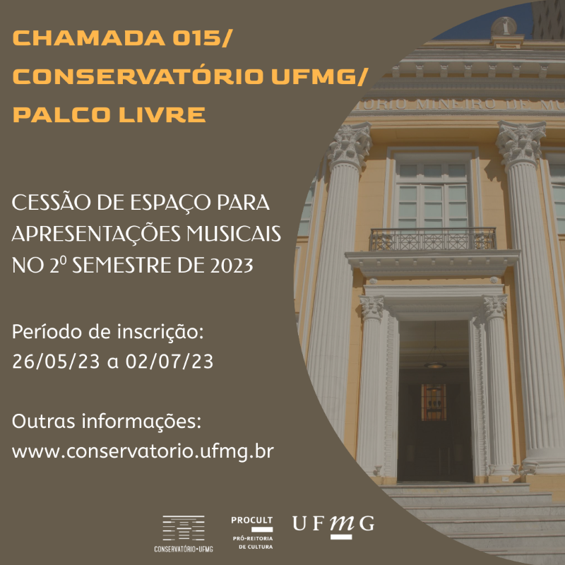 Está aberta, até 2 de julho, a seleção de músicos ou grupos de música erudita ou popular interessados em integrar a programação do Conservatório UFMG no segundo semestre de 2023. Os selecionados irão se apresentar entre agosto e novembro de 2023, em data a ser proposta pela produção, às terças ou às quintas-feiras, sempre às 19h30. As inscrições devem ser feitas mediante preenchimento de formulário-proposta disponibilizado na página do Conservatório UFMG.