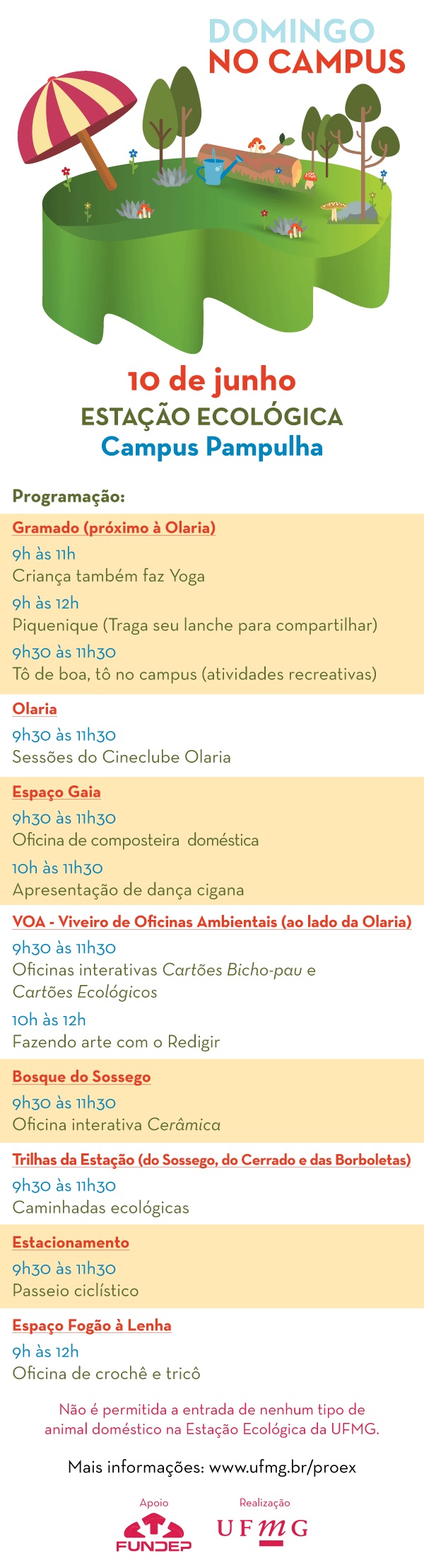 A 13ª edição do Domingo no Campus está marcada para o dia 10 de junho. Com entrada franca, o evento acontece das 8h às 13h, nos 114 hectares da Estação Ecológica da UFMG. A Estação Ecológica fica no campus Pampulha da UFMG. Outras informações estão disponíveis no facebook.com/domingonocampusufmg.