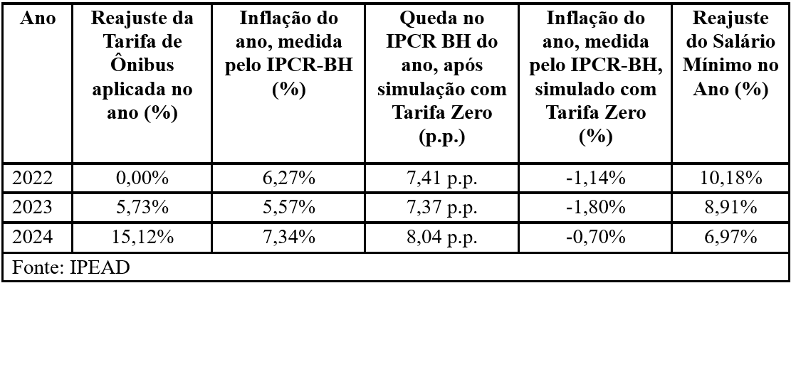 Em todos os anos simulados, a Tarifa Zero teria revertido a inflação medida pelo IPCR-BH em valores negativos, variando de -1,80% (2023) a -0,70% (2024). Isso significa que, para as famílias que mais dependem do transporte público, o custo de vida cairia de forma substancial.