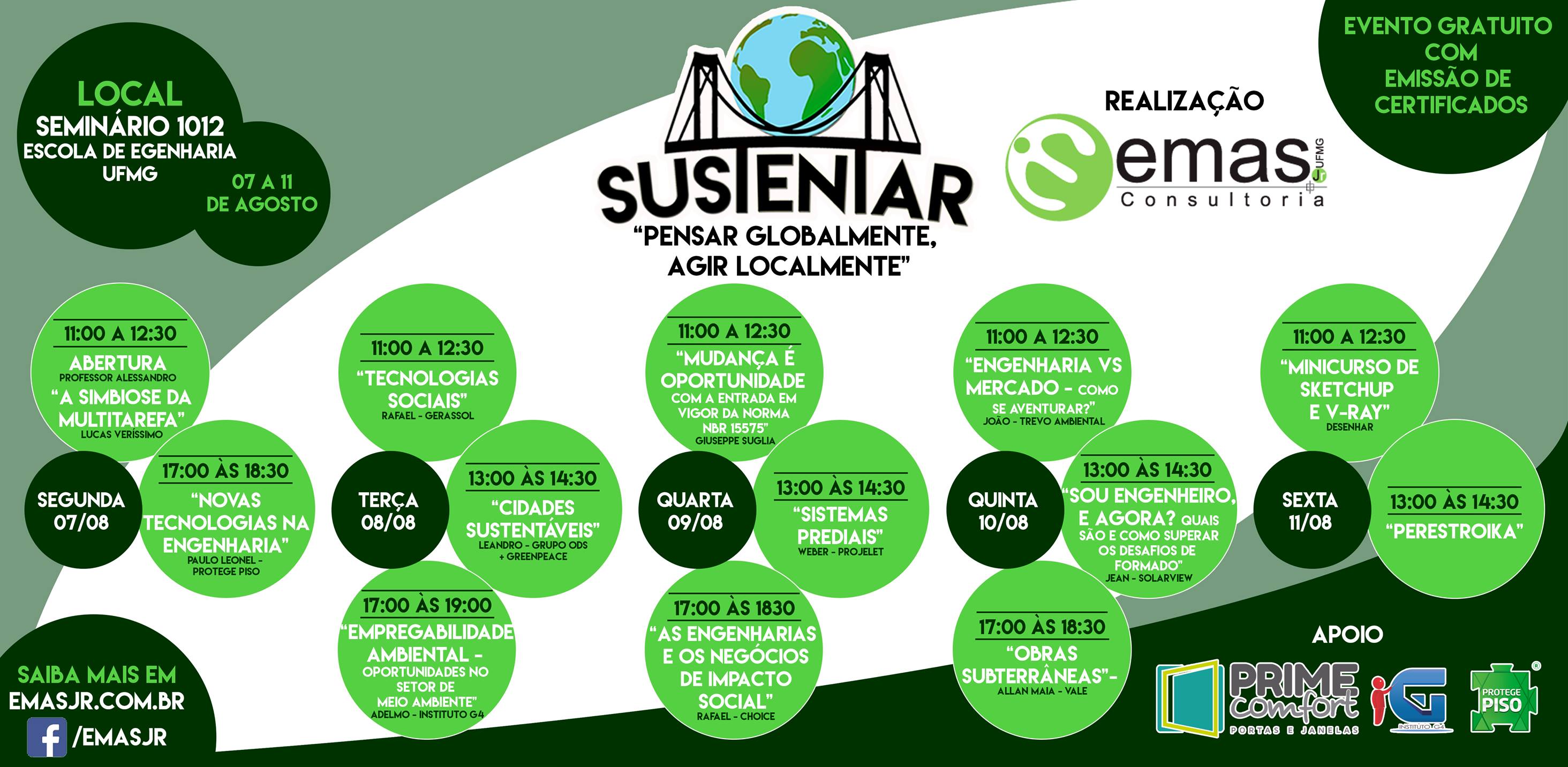 A Emas Júnior, empresa júnior dos cursos de Engenharia Civil e Engenharia Ambiental da UFMG, vai realizar a segunda edição do 'Sustentar', evento destinado ao debate e à capacitação sobre temas relacionados a empreendedorismo, sustentabilidade, engenharias e inovações tecnológicas.
