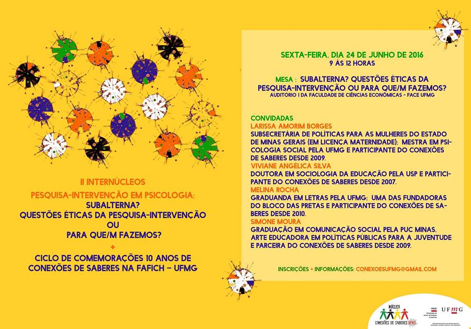 O Núcleo Conexões de Saberes realiza o 2º Internúcleos Pesquisa-intervenção em Psicologia, com o tema 'Subalterna? Questões éticas da pesquisa-intervenção ou para que/m fazemos?'. O evento terá participação de núcleos de pesquisa de diversas universidades.