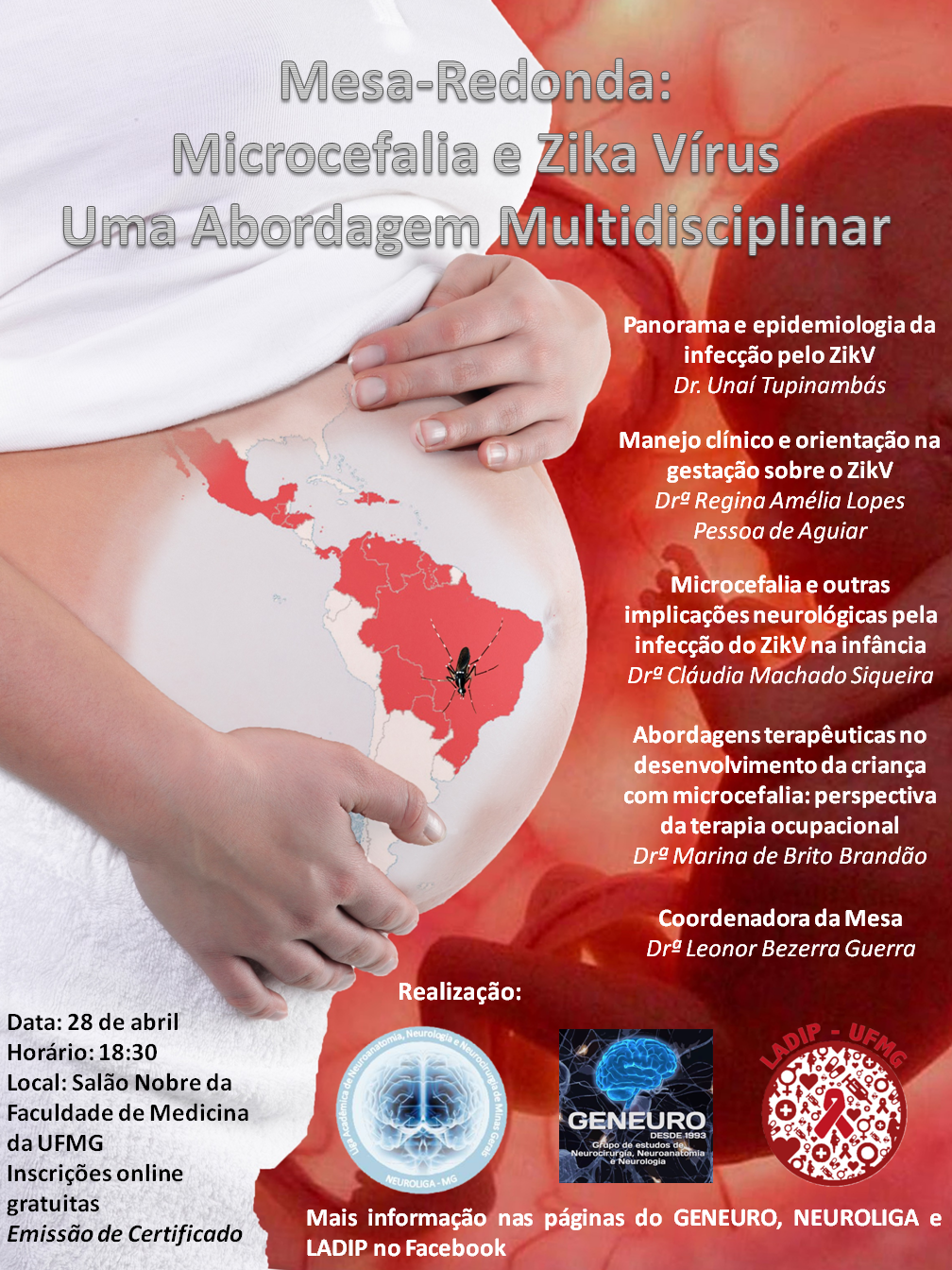 O Grupo de Estudos em Neurologia (Geneuro), a Liga de Neurologia (Neuroliga) e a Liga de Doenças Infecciosas e Parasitárias (Ladip) da Faculdade de Medicina da UFMG realizarão, no dia 28 de abril, a mesa-redonda 'Microcefalia e Zika vírus - uma abordagem multidisciplinar'.