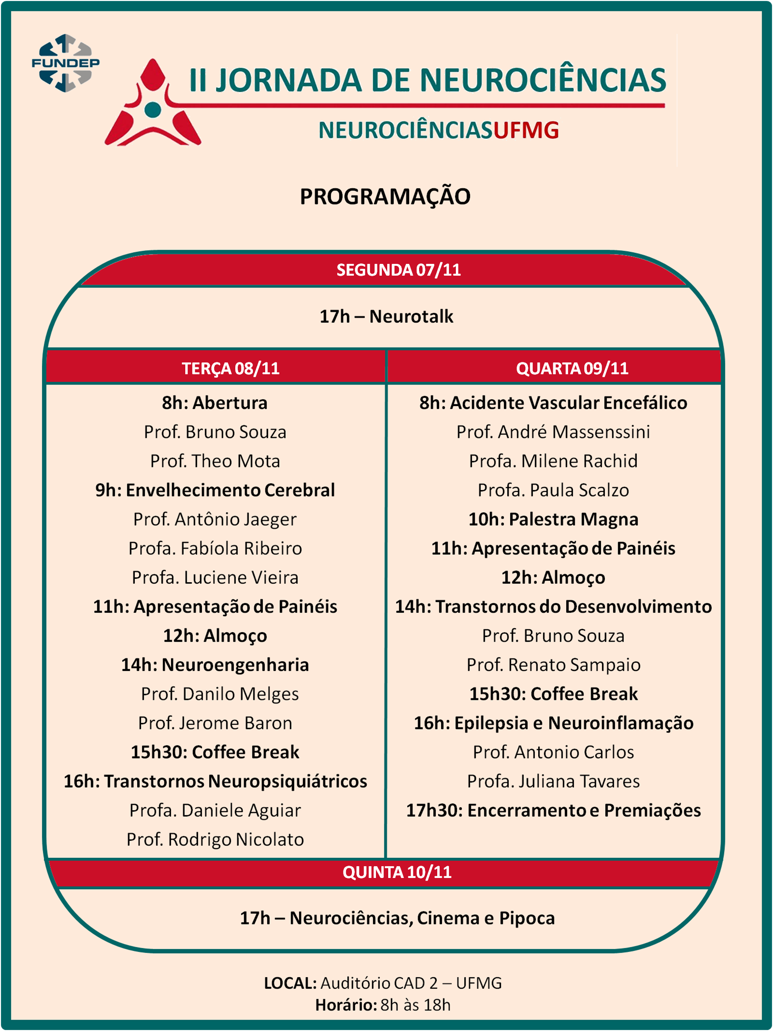 A programação inclui sessões dos projetosNeurotalk, que organiza bate-papo informal mensal com um neurocientista sobre temas da neurociência do cotidiano, e Neurociência, cinema e pipoca, que promove exibição de filmes e discussão sobre as bases neurocientíficas neles abordadas.