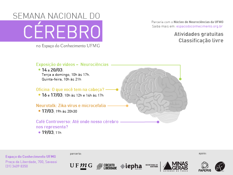 O Espaço do Conhecimento, em parceria com o Núcleo de Neurociências da UFMG, integra, pelo segundo ano, a programação da Semana do Cérebro. As atividades ofertadas têm classificação livre, são gratuitas e se dividem entre o Campus Pampulha e o Espaço do Conhecimento. A programação do evento conta com dois debates, exibição de filme sobre o tema, oficinas e exposição de vídeos. Além disso, será realizado o debate ‘Neurotalk’, sobre o zika vírus e os caso de microcefalia, com a participação das professoras da Faculdade de Medicina da UFMG, Juliana Gurgel Giannetti e Marise Oliveira Fonseca.