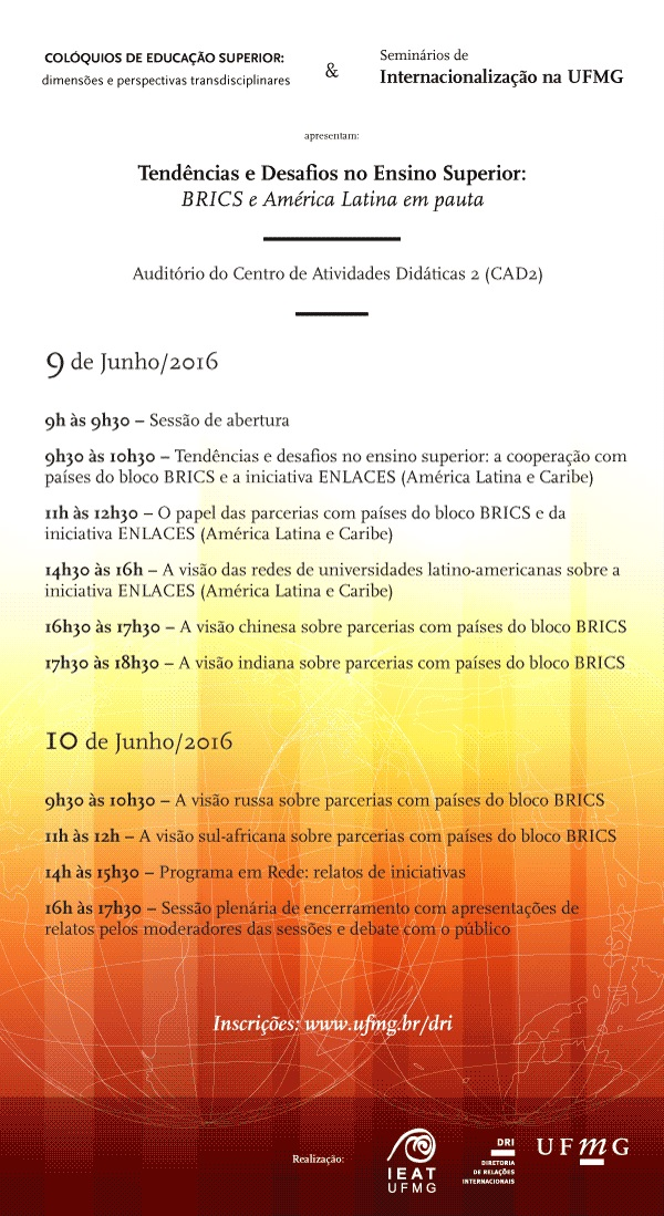 O seminário internacional 'Tendências e desafios no ensino superior: Brics e América Latina em pauta' vai reunir representantes dos integrantes do bloco Brics – Brasil, Rússia, Índia, China e África do Sul – e da América Latina para discutir seus sistemas educacionais e processos de internacionalização.