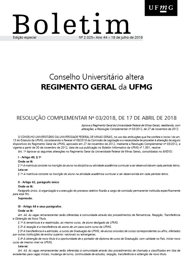 O CONSELHO UNIVERSITÁRIO DA UNIVERSIDADE FEDERAL DE MINAS GERAIS, no uso das atribuições que lhe confere o inciso I do art. 13 do Estatuto da UFMG, considerando o Parecer n° 08/2018 da Comissão de Legislação e a necessidade de proceder à alteração de alguns dispositivos do Regimento Geral da UFMG, aprovado em 27 de novembro de 2012, mediante a Resolução Complementar n° 03/2012, e vigente a partir de 30 de novembro de 2012, data de sua publicação no Boletim Informativo da UFMG n° 1.801, resolve: